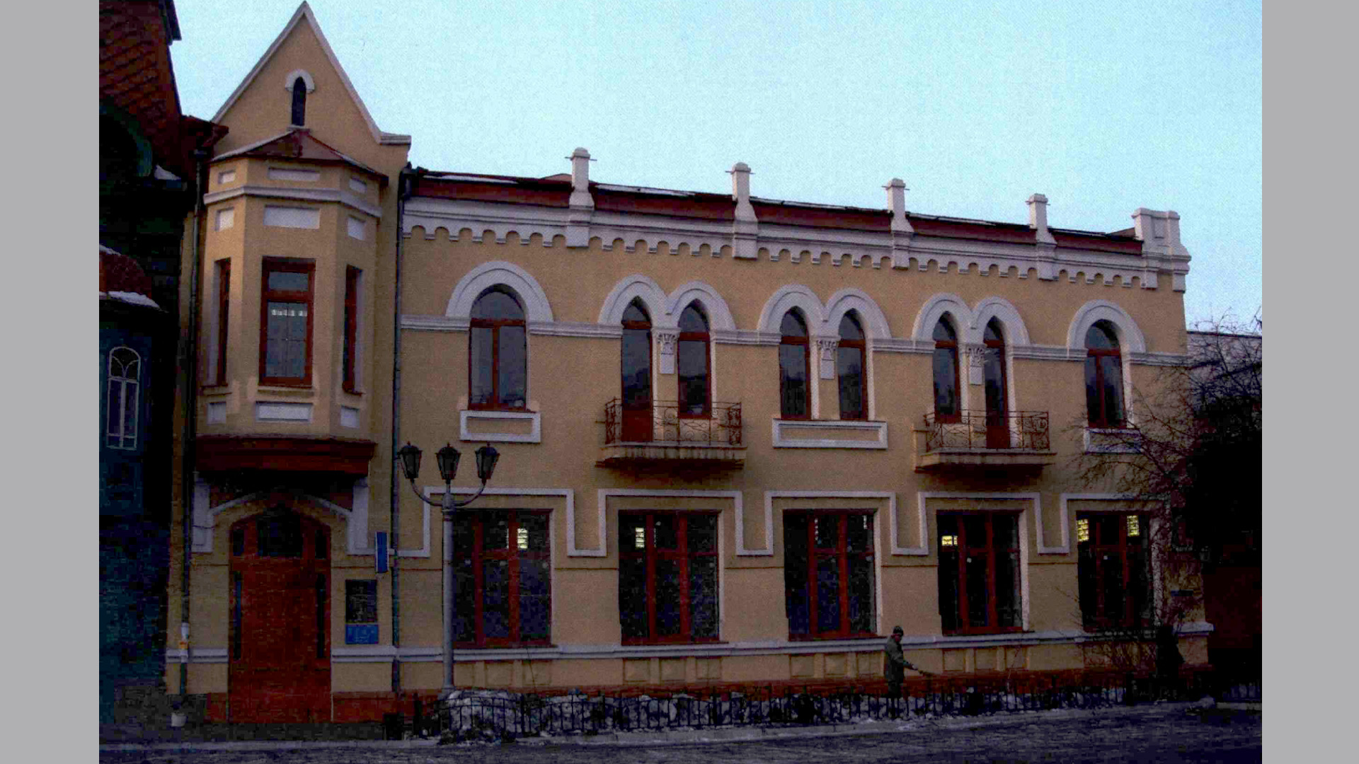 II.3.1.б. Эркер. В уровне 2-го этажа 5- гранный с шатровой невысокой кровлей. Низ подчеркнут аркатурным поясом, ограниченном ступенчатыми свесами на флангах. Г рани завершены фризовым поясом с профилированным краем и нишками над проемами. Оконные проемы прямоугольные с подоконным карнизом прямоугольного сечения и одностворчатыми рамами с фрамугами; сверху и снизу прямоугольные нишки; подоконная нишка на лицевой грани с профилированной филенкой.