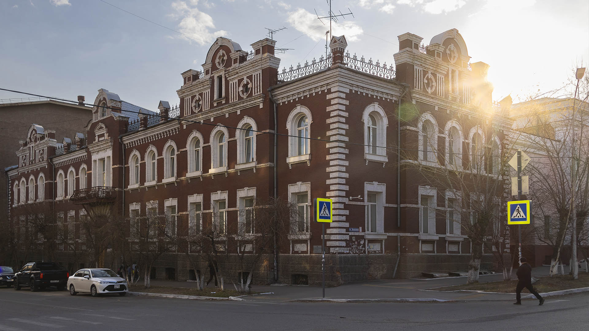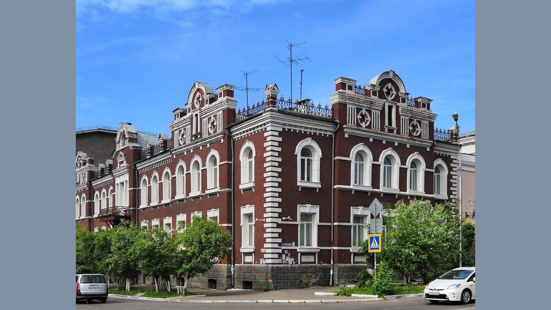 «Построен в 1907 С.Г. Файнгольдом. Крупное 2-этажное, угловое, из красного облицовочного кирпича на полуподвале здание, выстроенное и декорированное в стиле эклектики. Фасад украшают ризалиты с богато декорированными завершениями в уровне кровли. Особо оформлен парадный вход. В 1917 в здании размещался военный госпиталь «Виктория», в этом же году хозяином дома стал М.А. Бергут, к-рый открыл в нем типографию. В годы правления атамана Г.М. Семенова в помещении располагался штаб 3-го пехотного полка, затем штаб ЗабВО. После 1917 дом перешел в ведомство районного совета профсоюзов, к-рый имел библиотеку (детскую и взрослую), издательство газеты «Рабочий путь». В подвале дома находились ресторан с бильярдной Сиб. товарищества и ресторан «Шари-Вари», молочный магазин «Одесская кухмистерская» А.Ф. Навлиди. В 1924 открылись табачная фабрика «Лопато и Свей», ресторан артели инвалидов «Ливадия» с бильярдной на месте «Шари-Вари». В нач. 1950-х в здании располагались совпартшкола, в нач. 1970-х гостиница Чит. обкома КПСС, в нач. XXI в. — гостиница Управления делами обл. адм.»