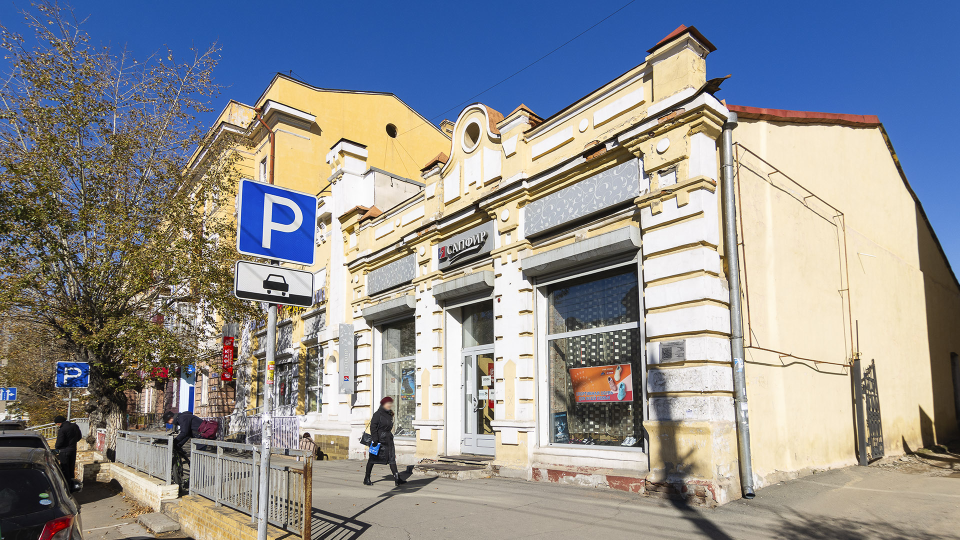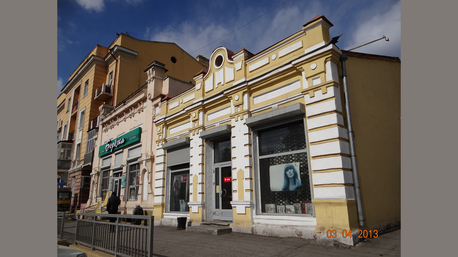 «Торговое одноэтажное каменное здание с лаконичным декором было построено в 1921 г. торговым товариществом «Иктисад», распорядителем которого был член татарской общины Г.Б. Бикмуллин. Владелец пристроил здание вплотную к юго-восточному фасаду дома А.А. Бутакова (позже Г.М. Бутаковой), который проектировался архитектором Л. Коргановым как электротеатр и магазин. По его проекту, утвержденным вице-губернатором Забайкальской области в 1914 г., дом Бутакова должен был состоять из трех повторяющихся объемов, но при строительстве были внесены изменения. Реализованным оказался только левый фасад здания. Позже среднюю площадь предполагаемой застройки заняло трехосное здание, главным фасадом, выходящее на красную линию средней части улицы Амурской и составившее с левым объемом один архитектурный ансамбль и один почтовый адрес. Оба дома имели глубокие подвалы, где хранилось замороженное мясо. Позже подвалы строений были соединены общим входом с перегородками. С самого начала здание служило городу как торговый центр. Своим расположением, удобством и пластикой главного фасада, функционирующие в нем разные магазины привлекали массу покупателей. В советское время здесь располагался комиссионный магазин и другие торговые учреждения.