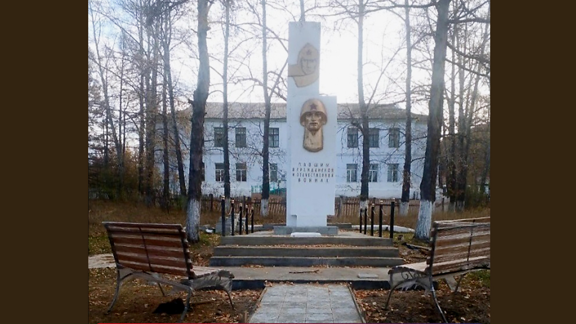 «Находится в сквере перед зданием средней школы. Обращен на юго-запад. Представляет собой объемную композицию из двух разновысоких пилонов прямоугольной формы, примыкающих друг к другу, установленных на двухступенчатом плоском основании и бетонированной площадке. Материал – бетон. На лицевой грани высокого пилона (вверху пор третное изображение красногвардейца в буденовке, а на нижнем пилоне барельефный портрет воина Советской Армии и под ним надпись в технике врезки: «Павшим в гражданской и Отечественной войнах». Буквы окрашены бронзовой краской. Барельеф окрашен охрой. По углам площадки перед пило нами цветочные гаши (бетон). Высота пилонов: 6 и 4,5 м. Сечение низкого пилона 1,1 х 0,9 м. Ступени основания: 2 х 3 и 2.6 х 3,6 м. Площадка 9 х 4,5 м».