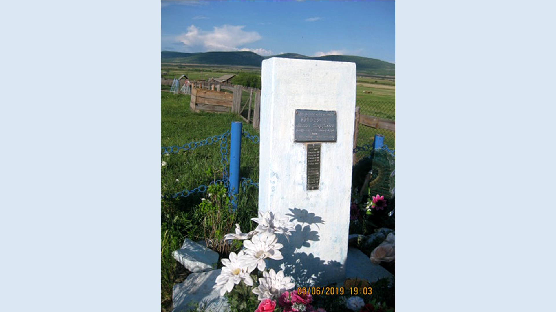 Обелиск высотой 125 см; сечение 48х16 см. Основание 113х69 см; высота 10 см. Могильный холм 4,5х1,8 м. Ограда металлическая (трубы, цепи), окрашена голубой краской. В плане 5,6х2,8 м. Высота 105 см».