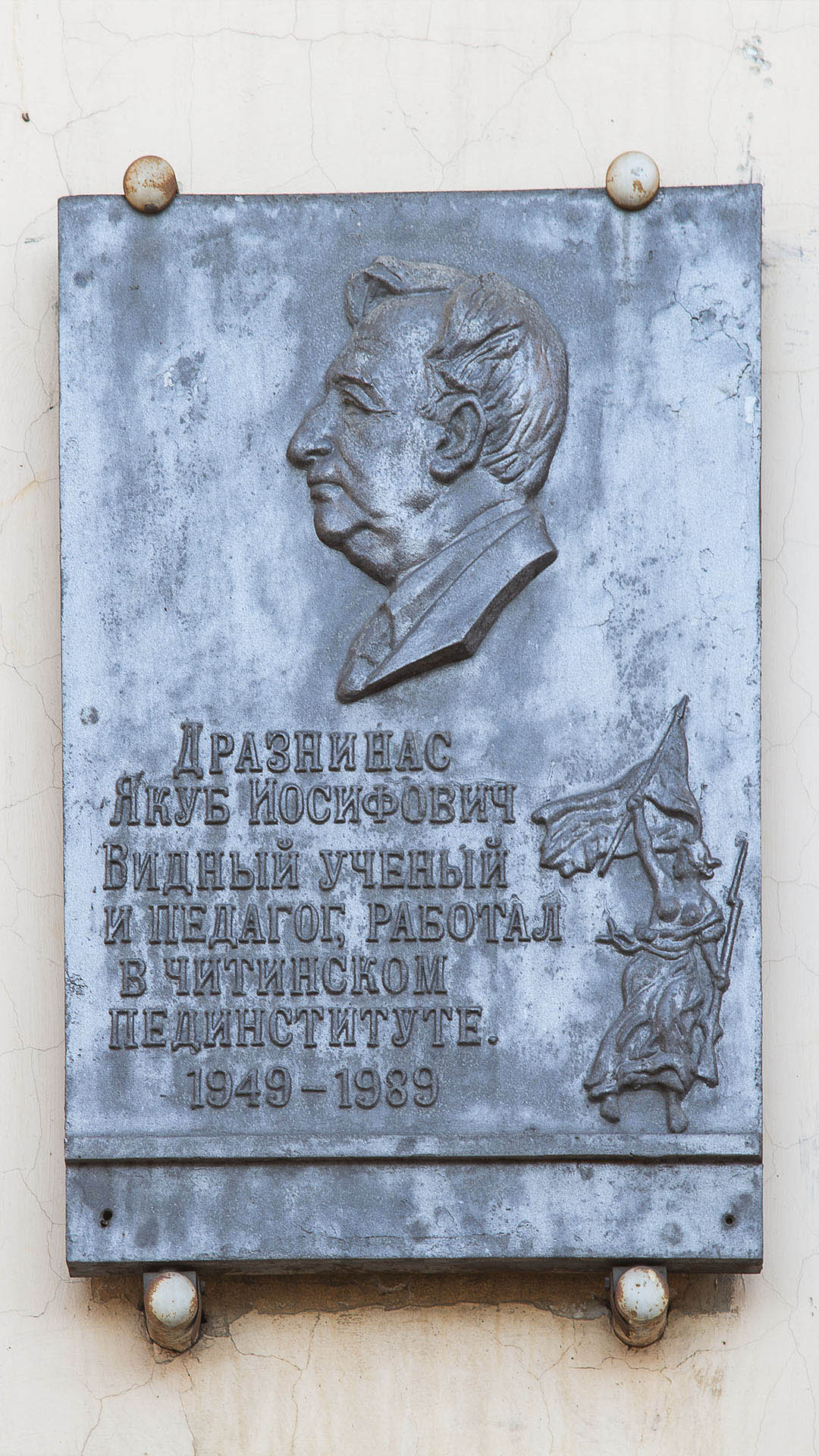 “Дразнинас Якоб Иосифович (2.10.1911, посад Серее Сувалкской губ. — 1.10.1989, Чита), канд. ист. наук. По окончании Мариямпольской гимназии в 1927 поступил на 2-годичные педагогические курсы в г. Каунасе. В 1929–40 учитель начальной школы в г. Укмерге. С установлением Сов. вл. в Литве в 1940 назначен зав. 6-летней школой в Рокишкисье, где работал до начала войны. Участник ВОВ (1941–43), тяжело ранен. С 1944 обучался на ист. ф-те Ивановского гос. пед. ин-та, по окончании к-рого работал на кафедре всеобщей истории Ивановского ГПИ. Владел франц., нем. яз., ивритом. С 1949 в ЧГПИ, преподаватель истории нового и новейшего времени, спецкурсов: «Введение в международные отношения», «История Парижской Коммуны». Автор публикаций по истории Парижской Коммуны в отечественных и зарубежных изданиях. Награжден орденом Славы 3-й степени.”