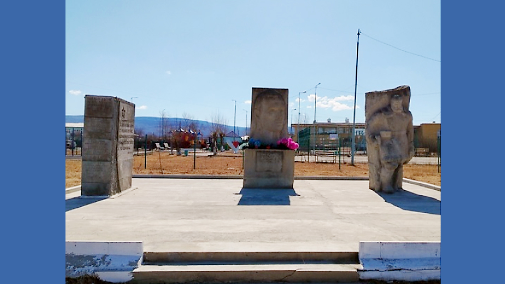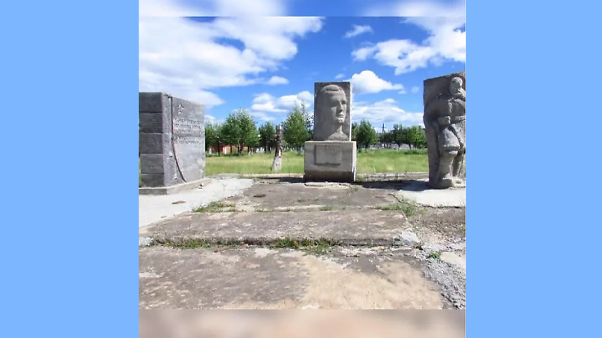 Правый памятник представляет собой вертикальную плиту (125 х 110 см. в основании) высотой 3,1 м. На ее фоне скульптура партизана в полушубке и с винтовкой в руке. На трех гранях левой стелы имеются надписи».