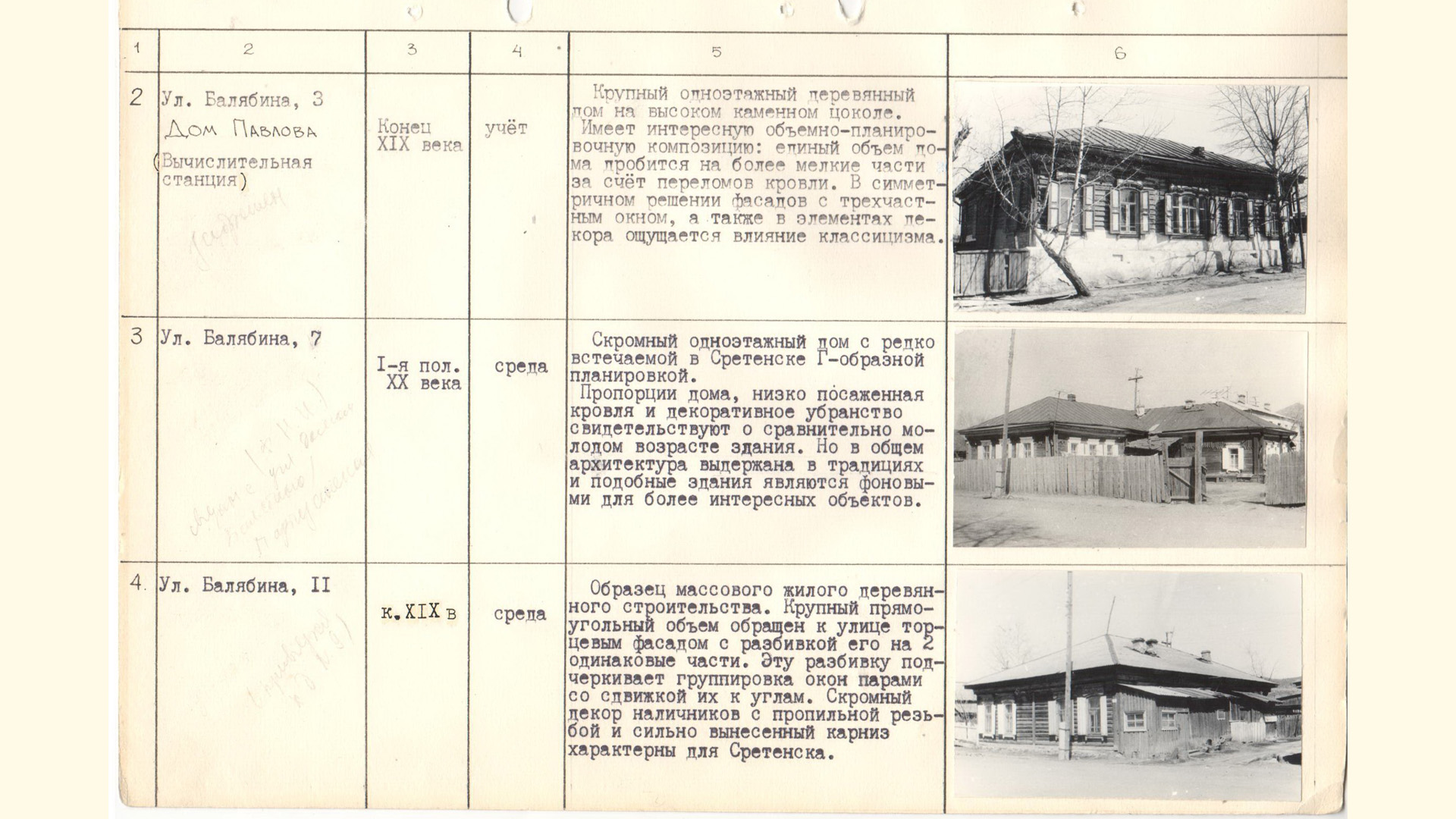 «Образец массового жилого деревянного строительства. Крупный прямоугольный объем обращен к улице торцевым фасадом с разбивкой его на 2 одинаковые части. Эту разбивку подчеркивает группировка окон парами со сдвижкой их к углам. Скромный декор наличников с пропильной резьбой и сильно вынесенный карниз характерны для Сретенска».