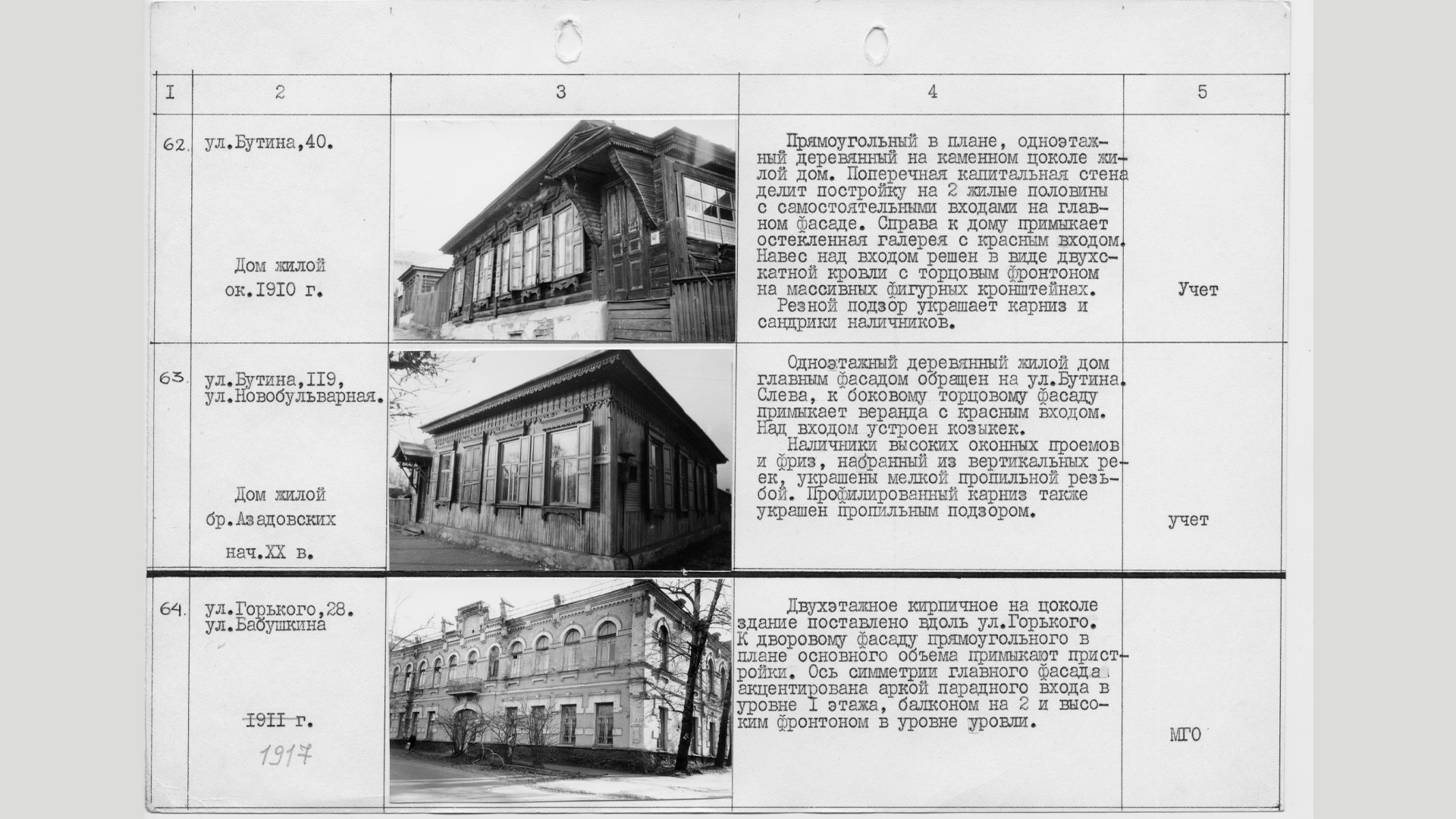 «Прямоугольный в плане, одноэтажный деревянный на каменном цоколе жилой дом. Поперечная капитальная стена делит постройку на 2 жилые половины с самостоятельными входами на главном фасаде. Справа к дому примыкает остекленная галерея с красным входом. Навес над входом решен в виде двухскатной кровли с торцовым фронтоном на массивных фигурных кронштейнах. Резной подзор украшает карниз и сандрики наличников».