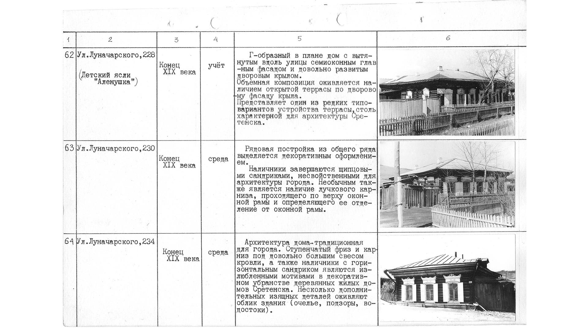 «Г-образный в плане дом с вытянутым вдоль улицы семиоконным главным фасадом и довольно развитым дворовым крылом. Объемная композиция оживляется наличием открытой террасы по дворовому фасаду крыла. Представляет один из редких типо-вариантов устройства террасы столь характерной для архитектуры Сретенска».