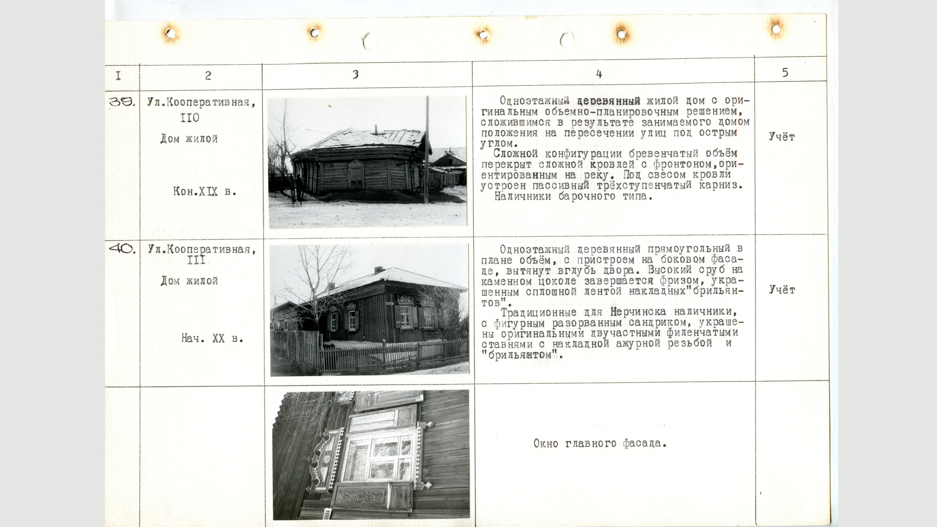 «Одноэтажный деревянный жилой дом с оригинальным объемно-планировочным решением, сложившимся в результате занимаемого домом положения на пересечении улиц под острым углом. Сложной конфигурации бревенчатый объем перекрыт сложной кровлей с фронтоном, ориентированным на реку. Под свесом кровли утроен пассивный трехступенчатый карниз. Наличники барочного типа».