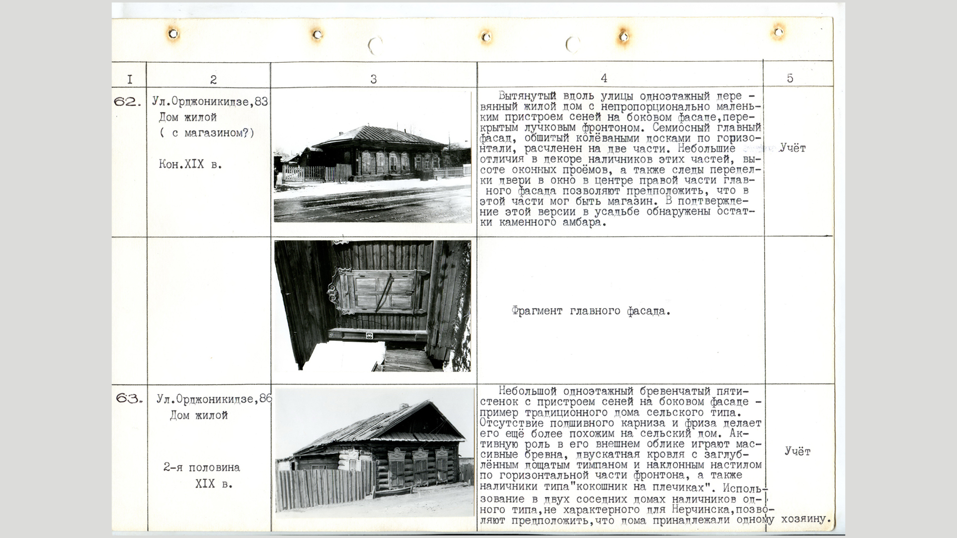 «Дом по ул. Оржоникидзе 83 принадлежал предположительно Г.М. Монарскому. По данным переписи 1917 года его владение находилось по ул. Старой, владение № 8. Владение арендовал А.Ф. Самодуров, 34 года, основное занятие торговля. Во владении было 1 отдельное жилое строение, каменный амбар. В жилом строении была одна квартира из шести комнат, магазин. В квартире проживали арендатор с женой, тестем — шорником, племянник, женщина приказчица, рабочие военнопленные. Владение Монарского находилось в 49 м квартале, ограниченном улицами Большая (Советская), Зензиновская (Ленская), Интендантская (Комсомольская), Старая (Оржоникидзе). Дом по ул. Старая (Оржоникидзе) был одно этажный, деревянный, вытянутый вдоль улицы».