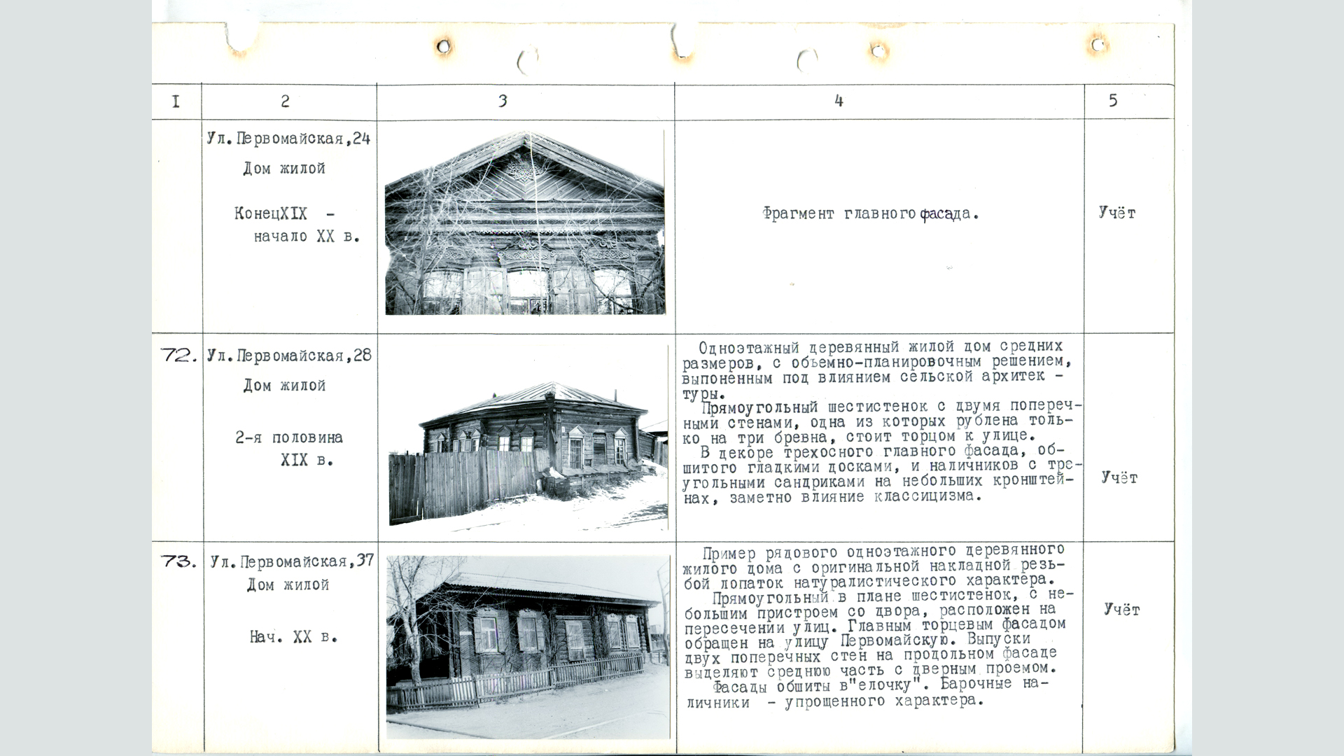 «Одноэтажный деревянный жилой дом средних размеров, с объемно-планировочным решением, выполненным под вилянием сельской архитектуры. Прямоугольный шестистенок с двумя поперечными стенами, одна из которых рублена только на три бревна, стоит торцом к улице. В декоре трехосного главного фасада, обшитого гладкими досками, и наличников с треугольными сандриками на небольших кронштейнах, заметно влияния классицизма».