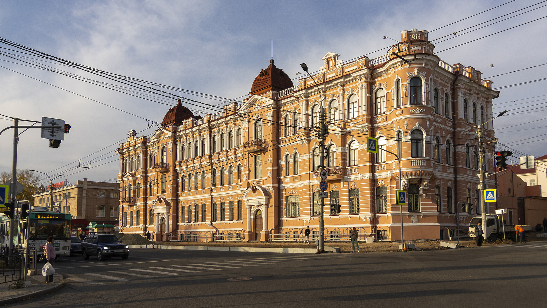 «После окончания стр-ва помещение заняли арендаторы. В 1915 в подвале дворца содержались 164 австрийских военнопленных. В марте 1918 проходило заседание съезда Советов рабочих. При атамане Г.М.Семенове во дворце размещалась канцелярия госпиталя, проходили концерты. В марте 1920 работала канцелярия япон. консула Огаты, в окт. 1920 располагалось Министерство иностранных дел ДВР, с 1923 Заб. губернский Совет профсоюзов. Дом стал называться Дворцом труда. В 1922 организована гос. публичная библиотека, в 1925 работал радиокружок. Летом 1937 здание перешло в ведомство ЗабВО, позже здесь разместилось управление НКВД Чит. обл. (НКГБ, МГБ, КГБ, МБ, РУ ФСК). РУ ФСБ располагается здесь и в наст. время. За стр-вом с 1912 наблюдал архитектор Ф.Е.Пономарев. К 1914 закончена часть здания (ныне существующая), стр-во 2-й очереди не предпринималось. Построен по проекту, получившему «Гран-при» на Всемирной выставке в Париже. Выполнен в стиле эклектики с элементами барокко и позднего классицизма. Крупный 3-этажный кирпичный дом с цокольным этажом и Г-образным планом. Симметричный гл. фасад раскрепован четырьмя ризалитами, 2 центр. завершаются 4-гранными куполами, боковые невысокими парапетами. Скошенный угол здания фиксируется цилиндрическим эркером. Эркер на массивных витых кронштейнах, к-рые украшены лепниной. Декоративные детали выполнены в нетрадиционной для Читы технике цементного литья. Верх. этаж дома особенно насыщен декором. Крайние ризалиты и ср. часть декорированы ордером. На фасаде одиночные колонны расположены между окнами, парные по краям ризалитов и в центре фасада. Зап. (гл.) и юж. фасады богато украшены лепниной с цветочными мотивами, маскаронами, горизонтальными междуэтажными тягами с лепниной в виде кистей и подвесок. Окна распашные в рассветных проемах. Полуциркульные окна на 2-м и 3-м этажах, лучковые на 1-м этаже, прямоугольные в цокольном этаже. На лев. фланге гл. фасада сохранился уличный фонарь. В хорошем состоянии ист. интерьеры: на лестничных площадках и в вестибюле – полы из керамических плиток с орнаментом; лестницы с каменными ступенями и кованым оригинальным ограждением; деревянные точеные балясины в вестибюле. Внутренние помещения (лестничные марши, потолки и стены на площадках, в коридорах, в кабинетах) богато декорированы лепниной. Лепными модульонами украшена арка в вестибюле, выявлены фрагменты росписей. В интерьерах сохранились 2 светильника уральских и венецианских мастеров. Используются ист. внутренняя разводка и приборы отопления. На срезанном углу дома (под эркером) находится мемориальная доска с текстом: «Здесь 24 марта 1918 г. 3-й Заб. съезд Советов рабочих, казачьих, крестьянских и бур. депутатов провозгласил установление Сов. вл. в Заб».