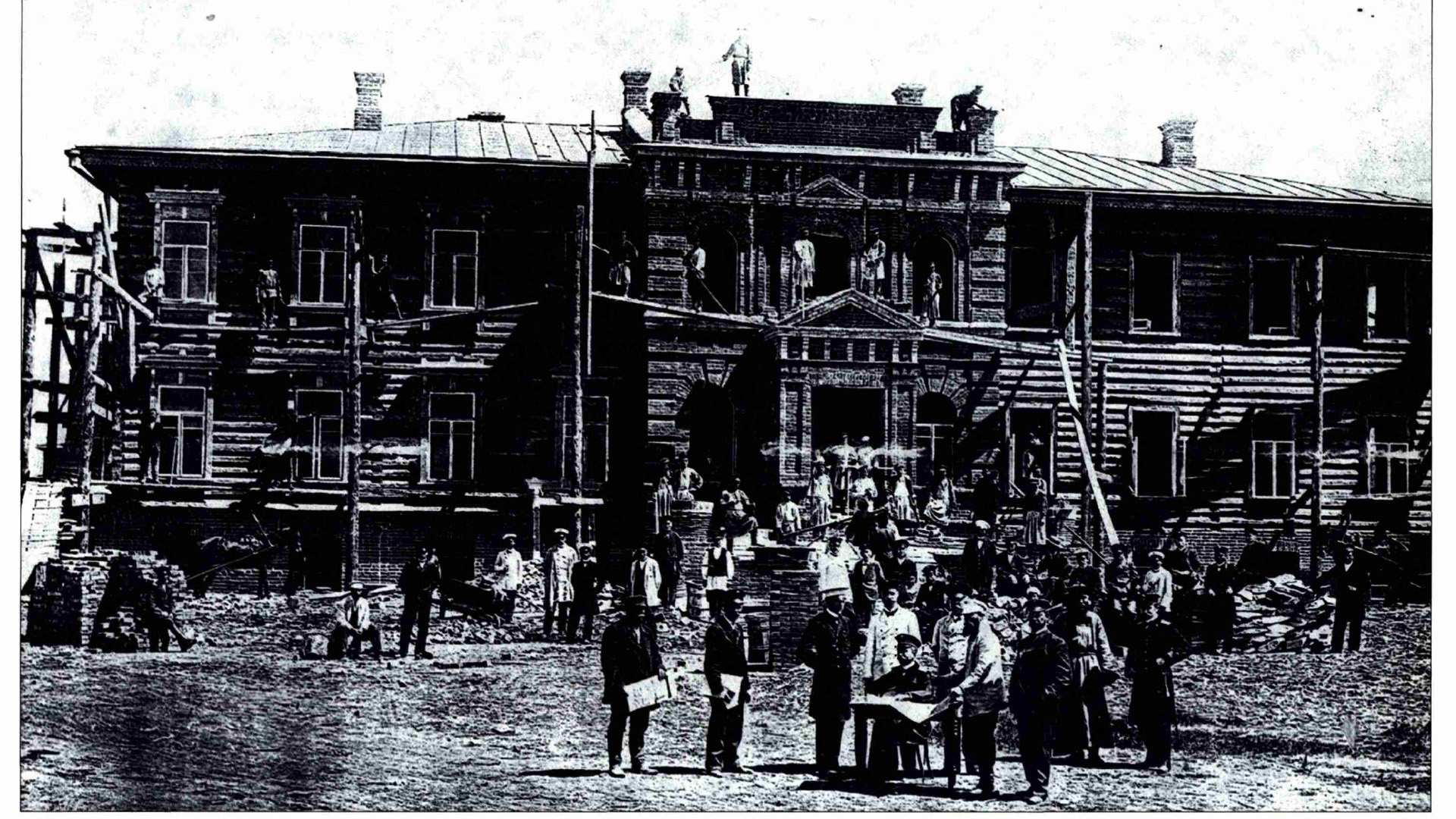 2.2. Объемно-планировочное решение. Здание на кирпичном цоколе с полуподвальными помещениями со смешанной конструкцией стен (кирпичные и деревянные). Основной объем здания двухэтажный, восточный ризалит разделен на три этажа и имеет отдельный вход. Кирпичный средний объем, выступает ризалитами с входами на юго-западном и северо-восточном фасадах, деревянные крылья флангов с ризалитами на северном и восточном углах. Имеет два главных фасада - юго- восточный и юго-западный с парадным входом. Сочетание в одном объеме различной этажности с применением смешанных конструктивных материалов, не имеет аналогов.