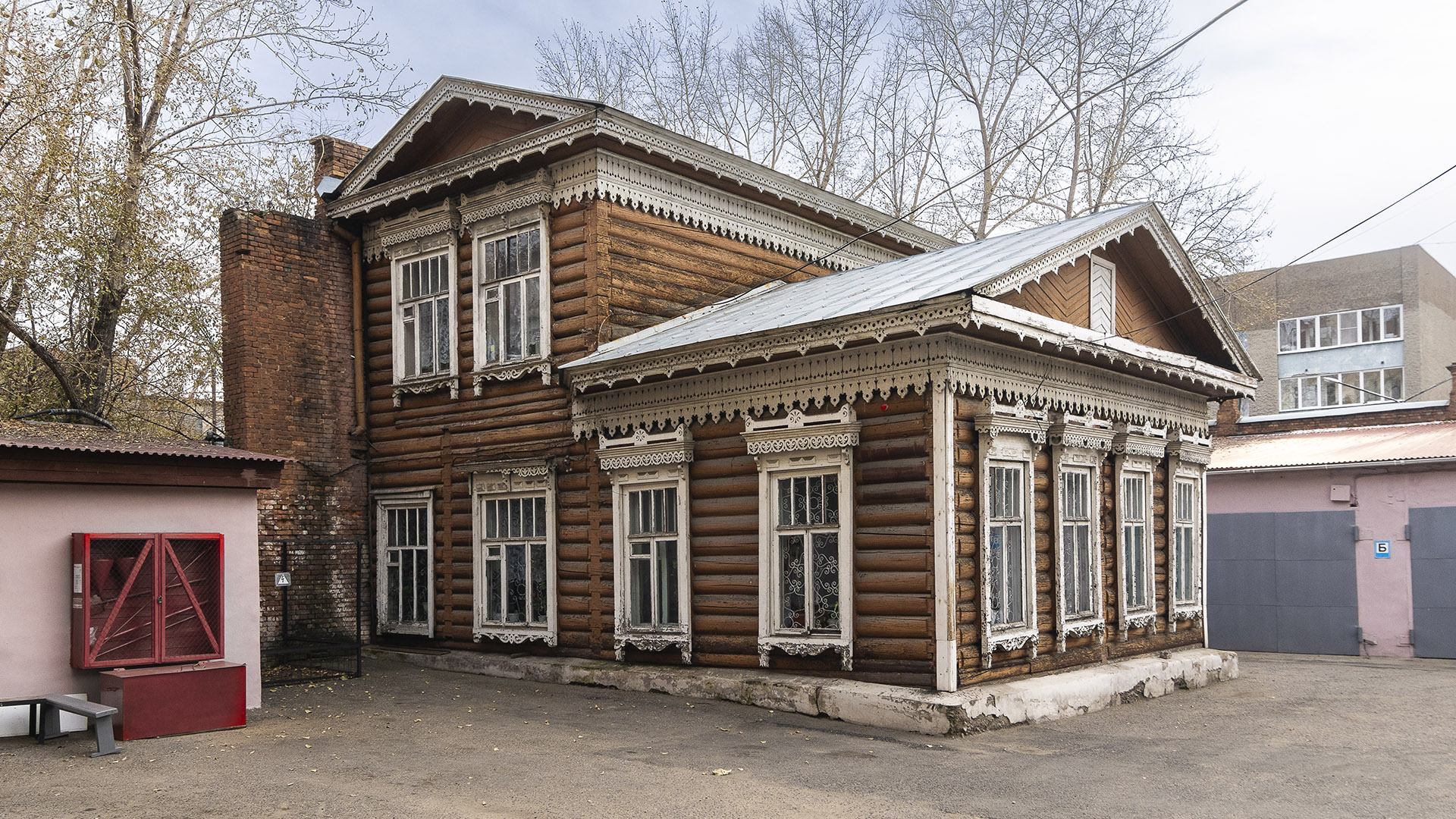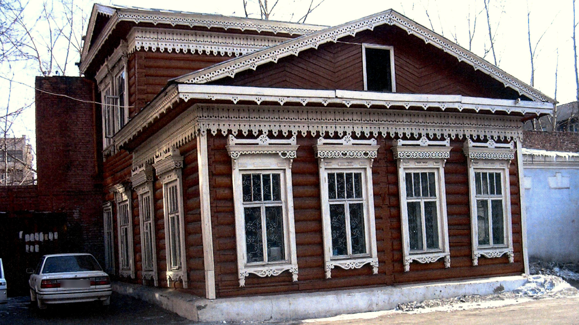 «Построен в 1895. Сложная объемно-планировочная композиция состоит из двух разноэтажных объемов. Бревенчатый жилой дом на бутовом ленточном фундаменте. Стены рублены «в лапу», углы обшиты. Декор построен на противопоставлении открытых участков сруба и пропильной резьбы наличников, фризовой полосы, широкой выносной плиты карниза с подзором».