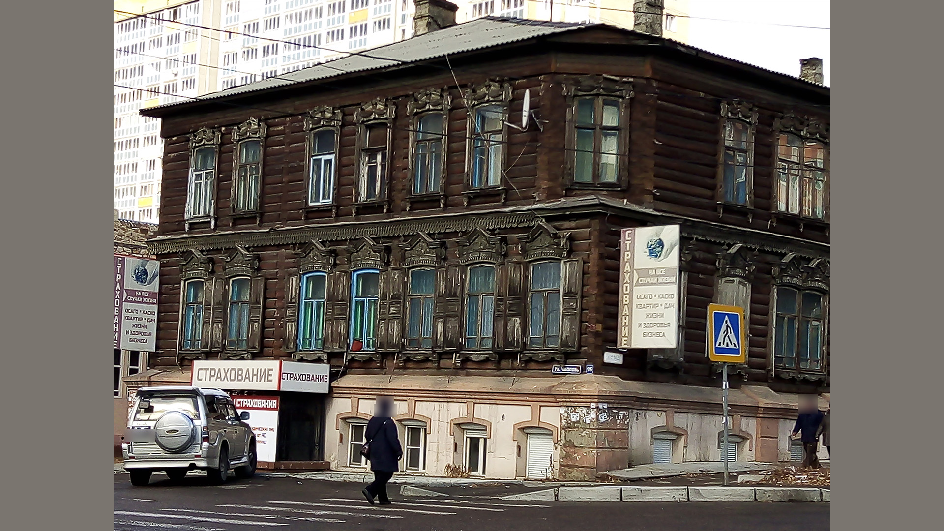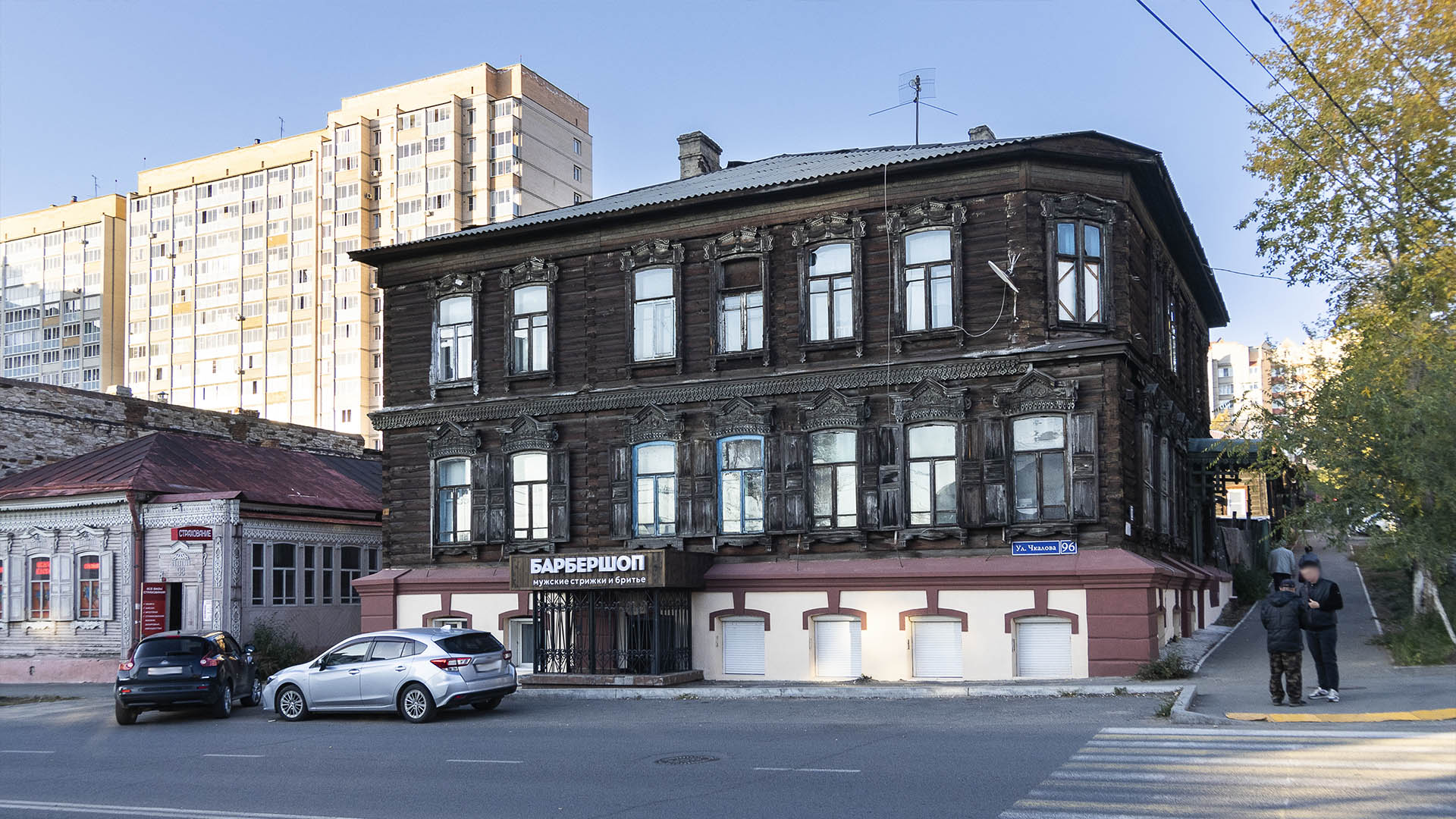 I. Градостроительные характеристики:1.1. Местоположение. В исторической застройке, главные юго-западный и юго-восточный фасады фиксируют исторические линии застройки ул. Чкалова и 9 января.1.2. Габариты. Двухэтажный дом с цокольным этажом. Размеры в плане 16,2 х 16, 9м. II. Архитектурные и конструктивные характеристики. II. 1. Объемно-пространственная композиция. Двухэтажный деревянный дом с цокольным этажом под вальмовой кровлей. В прямоугольный план дома вписана открытая Г-образная веранда в двух уровнях, с лестницей и П-образный в плане основной объем. В восточном крыле выгорожена лестничная клеть с парадным входом на юго-восточном фасаде. В северном углу - двухэтажный объем сеней. Южный угол дома скошен в уровне второго этажа. II.2. Материал стен. Бревенчатые стены рублены «в лапу». Цокольный этаж из бута и красного кирпича, оштукатурен, побелен. II.З. Элементы фасадов. II.3.1. Междуэтажный карниз. Профилированная рейка и трехрядная пропильная резьба по деревянной обшивке. II.3.2. Цокольный карниз профилированный, (юго-восточный, юго-западный, северо-западный фасады). II.3.3. Лопатки рустованные на главных фасадах. Отмечают выходы капитальных стен цоколя, выделены возвышающейся ступенью над цокольным карнизом. II.З.4. Окна цокольного этажа. Прямоугольные с лучковым завершением. П-образные наличники с замковыми элементами, объединенными цокольным карнизом. Переплеты деревянные распашные с глухой лучковой фрамугой. Ставни двухфиленчатые на северо-западном фасаде. II.3.5. Окна 1-го и 2-го этажей. Прямоугольные, с лучковым завершением. Переплеты деревянные с фрамугой, распашные, 4-х стекольные: (1-й этаж - с горизонтальным импостом в нижней трети переплета, 2-й этаж - в верхней трети переплета). Спаренные окна (2 шт.) на юго-восточном фасаде. II.3.6. Наличники 2-го этажа. Лобань в виде разорванного фронтона с профилированным карнизом с сухариками. Поле лобани заполнено обработанными рельефной резьбой накладками в виде гирлянды с фестонами, над стойками - накладки в виде бриллиантового руста, 8 - образные пропильные «уши» по бокам. Фронтон увенчан точеными маковками в среднем разрыве и над стойками, по скатам 8 - образные пропильные элементы. Стойки наличника с накладками в виде полуколонок и с криволинейными пропильными свесами. Фартук симметричный с профилированным карнизом над узкими накладками и бриллиантовым рустом по свесам, с пропильными 8 - образными элементами и кругом с рельефным радиальным узором между ними. II.3.7. Наличники 1-го этажа. Лобань в форме треугольника с плечиками, образована вертикальными пластинами с полосой подзора над проемом по контуру. Фланкирована накладками в виде бриллиантового руста в профилированной рамке, со свесами в виде ряда прямоугольных и ряда треугольных зубцов. Плоскость лобани разделена профилированной рейкой, раскрепованной на флангах, декорирована симметричной пропильной накладкой и криволинейными «ушами» на боковых гранях. Профилированный венчающий карниз с подзором увенчан симметричным пропильным кокошником и маковками над плечиками. Ниже профилированного подоконного карниза стойки наличника с кистеобразными свесами украшены рельефными накладками в виде пирамидок. Фартук симметричного ломаного очертания с профилированной рейкой по нижнему краю. Ставни трехфиленчатые, с лучковым верхом.II.3.8. Парадный вход 