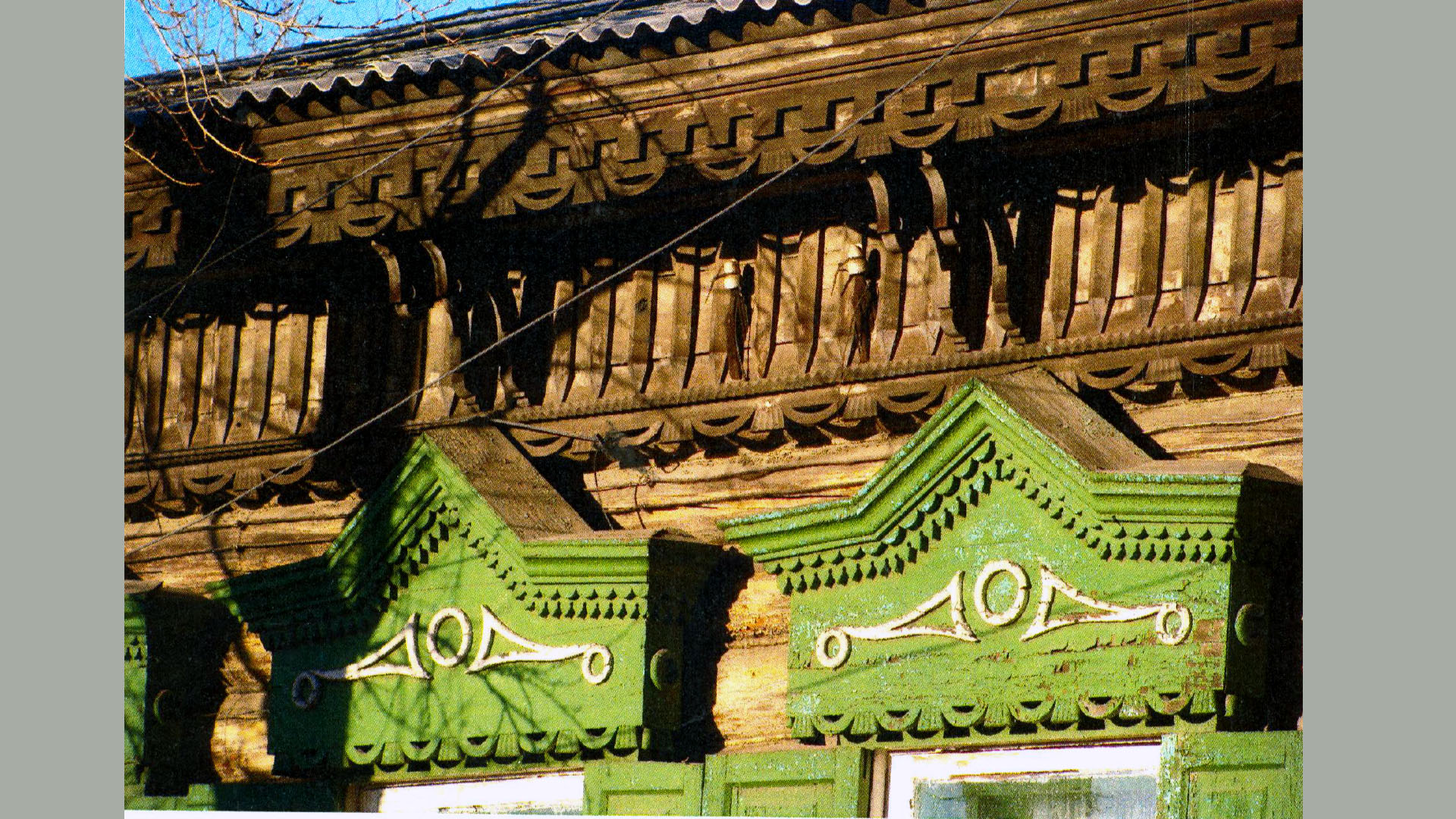 II.6.3. Фриз. По периметру основного объема, ленточный дощатый. На 3-х фасадах, кроме северо-восточного, рейка, с рельефной резьбой, отделяет низ фриза с пропильным краем в виде чередования лучковых дуг и трапециевидных свесов. В верхней части выполнена накладная резьба в виде горизонтальной профилированной рейки под венчающим карнизом, объединяющей ряд вертикальных пластин треугольного сечения с заострениями в нижней части. Аналогов оформления фриза в застройке города нет.